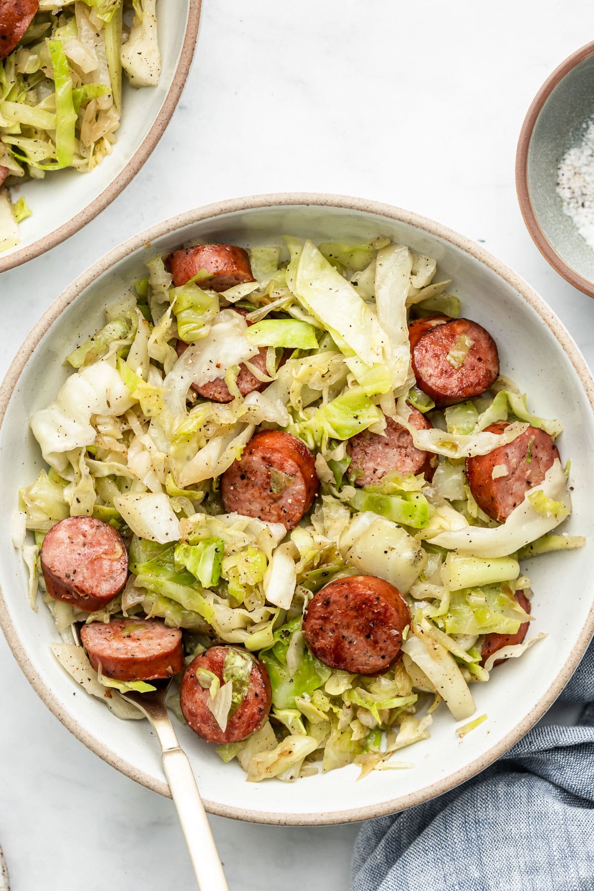 - Add sausage back to pan and stir until combined with cabbage. Cook for another 3 to 5 minutes until sausage is warmed and cabbage is tender. Taste and add more salt if desired.