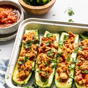 Our household is full of dietary restrictions and I have friends with type 2 diabetes. This recipe was the most delicious yet easiest one ever! Even the clean up was easy. I used Costco brand canned chicken to simply my life even more. I laid the scooped out zucchini onto the baking pan above the rows of zucchini boats and topped it with the leftover chicken and salsa mixture. This was a PERFECT recipe. It was kid approved by a super picky junk-loving eight year old, kid re-requested repeatedly by an 11 year old with loads of allergies, and the diabetic adult friends asked for more. This will be a staple in our kitchen. Thank you so much!!!
