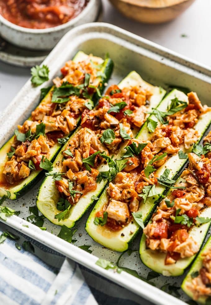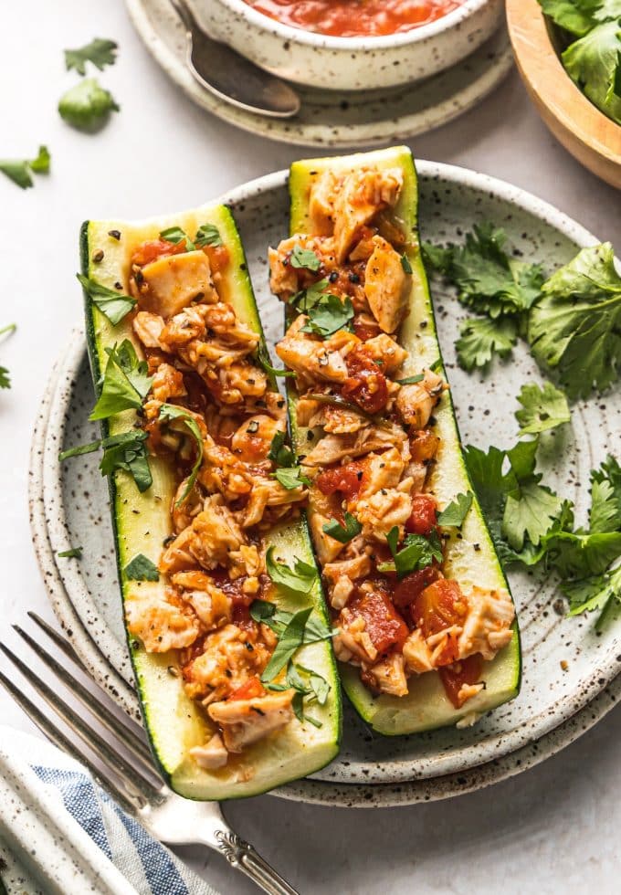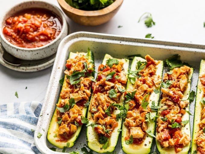 Instead of tortillas I’m using zucchini sliced lengthwise and turned into little boats. Scooping out the center of each zucchini means there’s room to stuff chicken and salsa in there!
