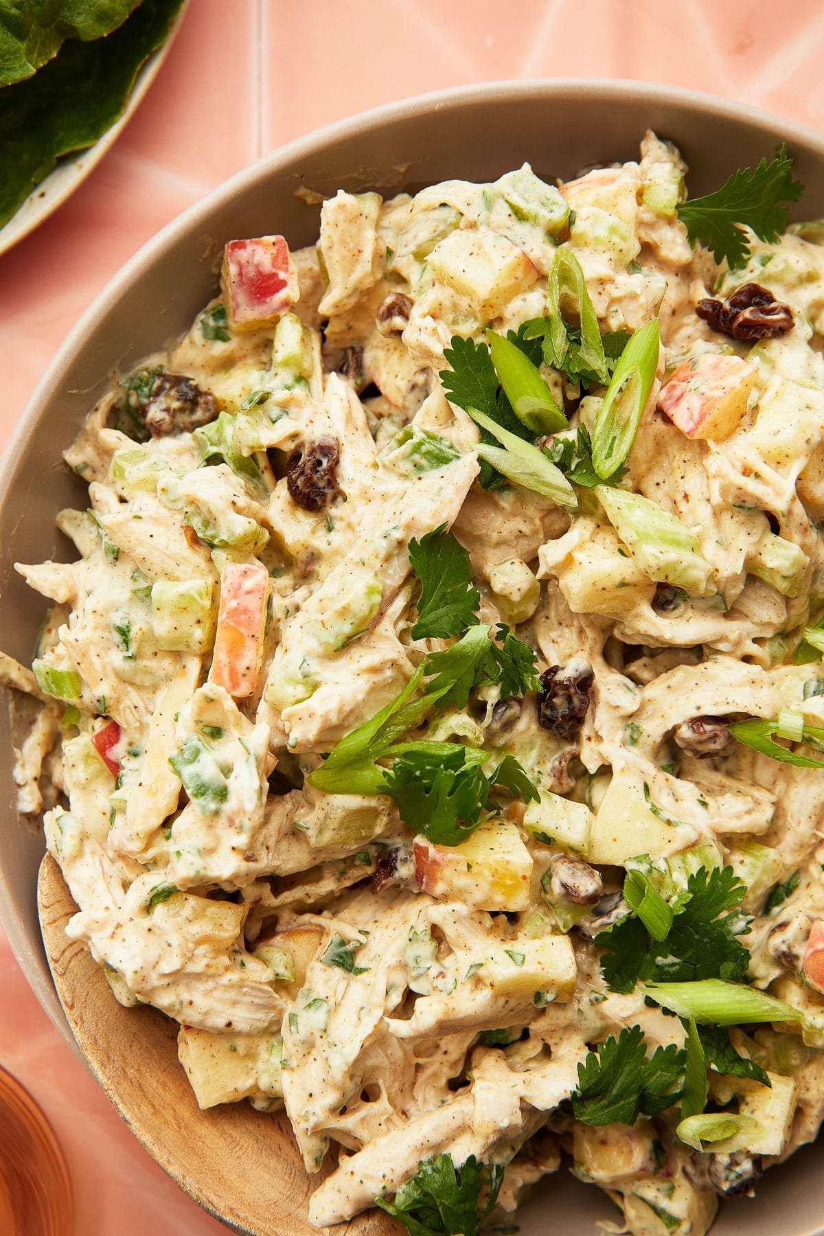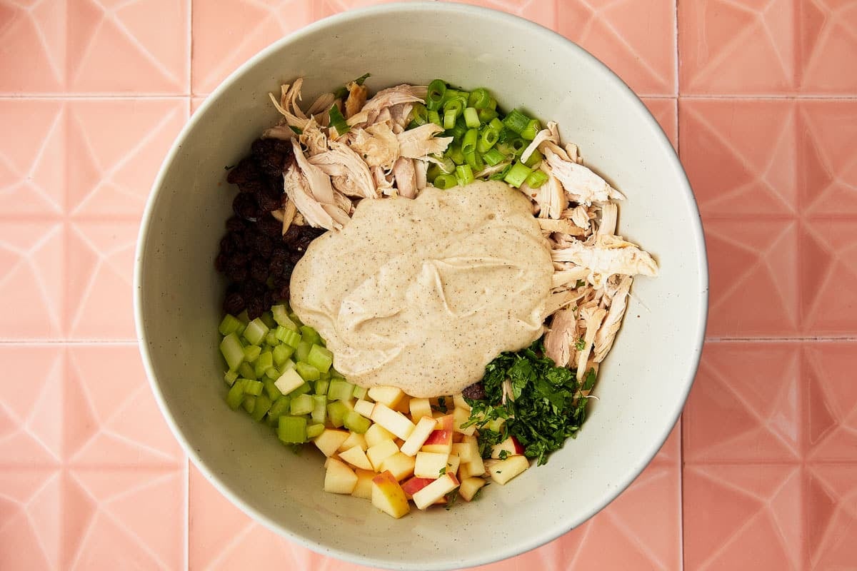 - Then stir in (to the same bowl) the shredded fully cooked chicken, celery, apple, green onion, cilantro, and raisins.