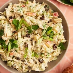 This no-mayo curry chicken salad has big curry flavor plus shredded chicken, diced apples, celery, and raisins. We’re keeping it light with nonfat greek yogurt too!