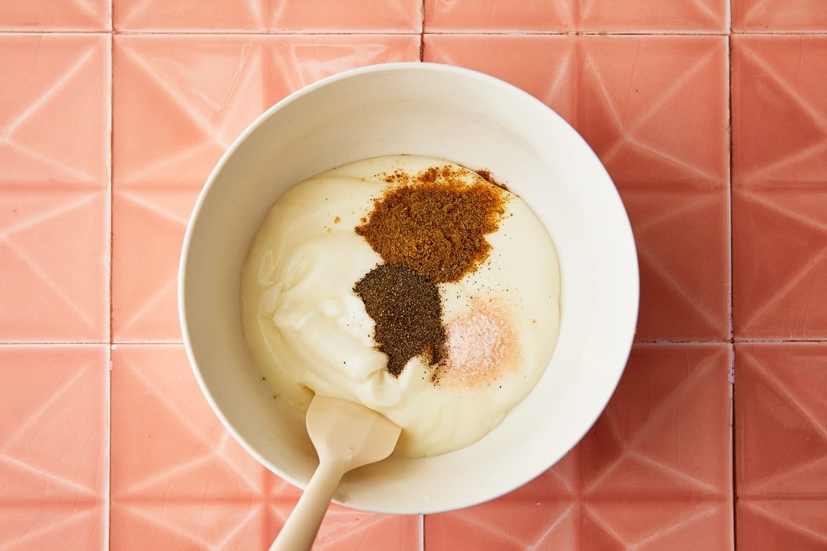 - Let's start by flavoring our yogurt base. This ensures that the curry powder is fully mixed in. In a large bowl (we'll use the same bowl for the other ingredients), stir together the yogurt, lime juice, curry powder, salt and pepper.