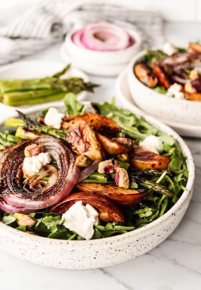 - Let's assemble the salad! Divide your arugula into bowls. Toss with remaining 2 tsp olive oil. Salt and pepper. Add asparagus, red onion, goat cheese, and peaches to each dish. Drizzle balsamic glaze over top. Sprinkle pistachios.
