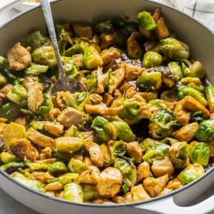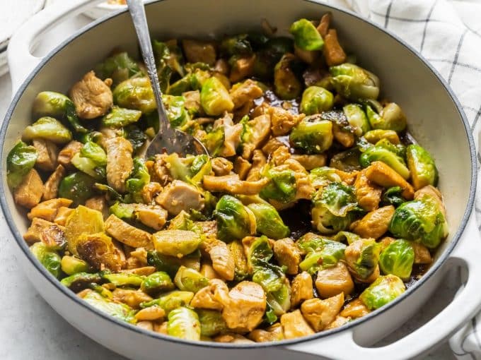 Did I say 25 minutes? Oh yes I did! This recipe cooks fast because we’re cutting our chicken into small cubes and slicing our brussels sprouts in half. It makes a big difference. Everything sautรฉs on medium high heat to add a bit of browning. Then we add the sauce ingredients and cover to get it all cooked through. Easy and fast, right?