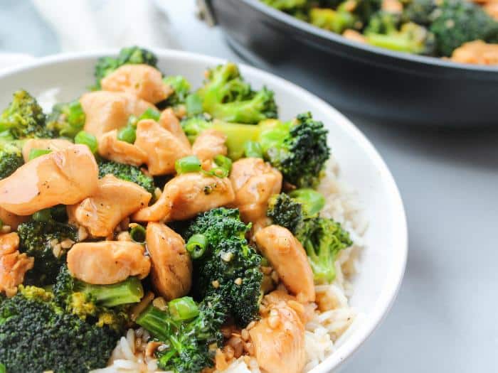 The chicken sautรฉs quickly on the stove. Then add fresh broccoli florets to the pan and steam them to bright green perfection. Once finished simply add the sauce ingredients. Whisk in a quick flour slurry. Now enjoy over rice. It’s that simple!