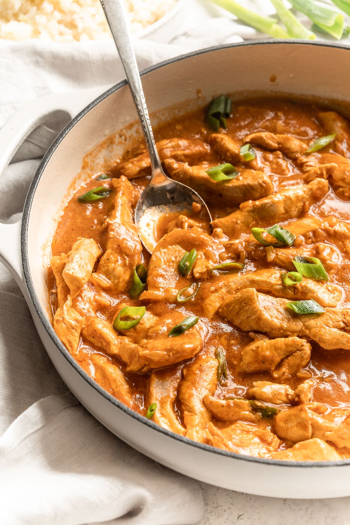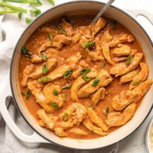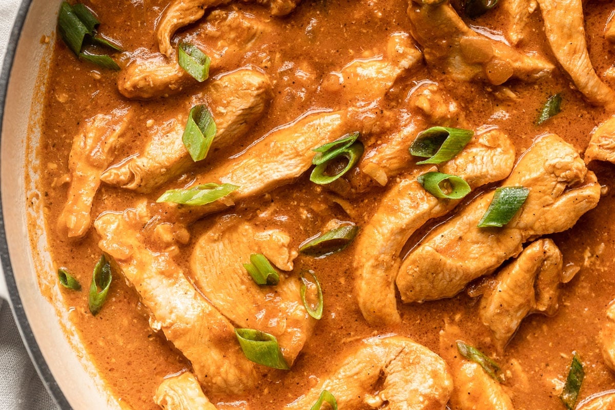 I get this question often but you really do need to stick with canned unsweetened coconut milk. Don’t even use the coconut milk that comes in a box or in the refrigerated section. Canned coconut milk is thick and not as watered down as other milks. That’s important for thickening our sauce!