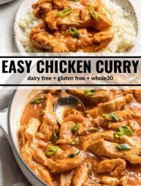 Serve everything over cauliflower rice for a satisfying dinner. Just cut a head of cauliflower into florets. Toss the florets into the blender. Blend until you have a rice like texture. Add the “rice” to a sautรฉ pan with a tablespoon of olive oil. Stir. Salt. Cover. In a few short minutes it will be ready! Ladle a hearty scoop of this Easy Chicken Curry over top and voila!