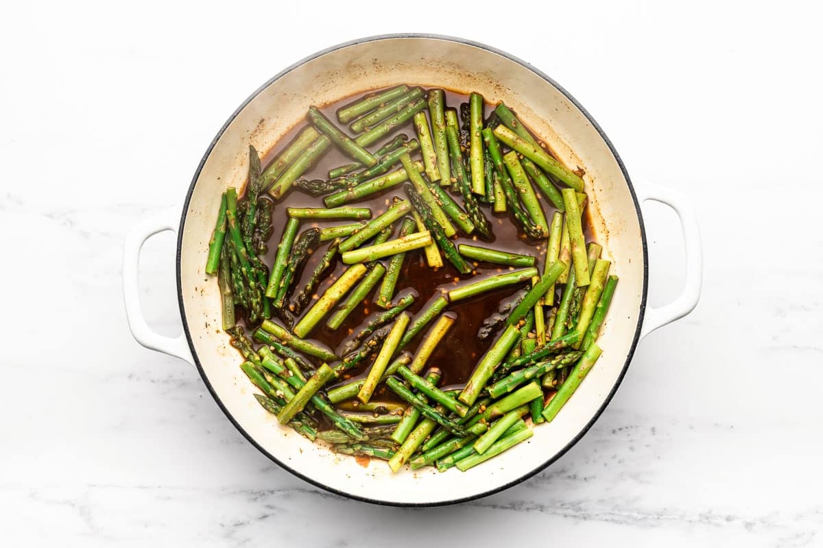 The sauce and asparagus go in the pan next. Asparagus cooks quickly (that’s one very important reason why I love it so) so just give it two or three minutes. Then add the chicken back to the pan.