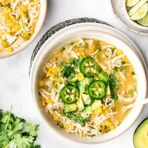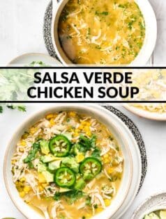 This Salsa Verde Chicken Soup will be your new favorite soup! It’s loaded with chicken and corn and can be topped so many fun ways. Use your favorite store-bought salsa verde to add a big punch of flavor. This easy dinner is designed to be light but you can make this a more filling soup by adding a can or two of canellini or white kidney beans.