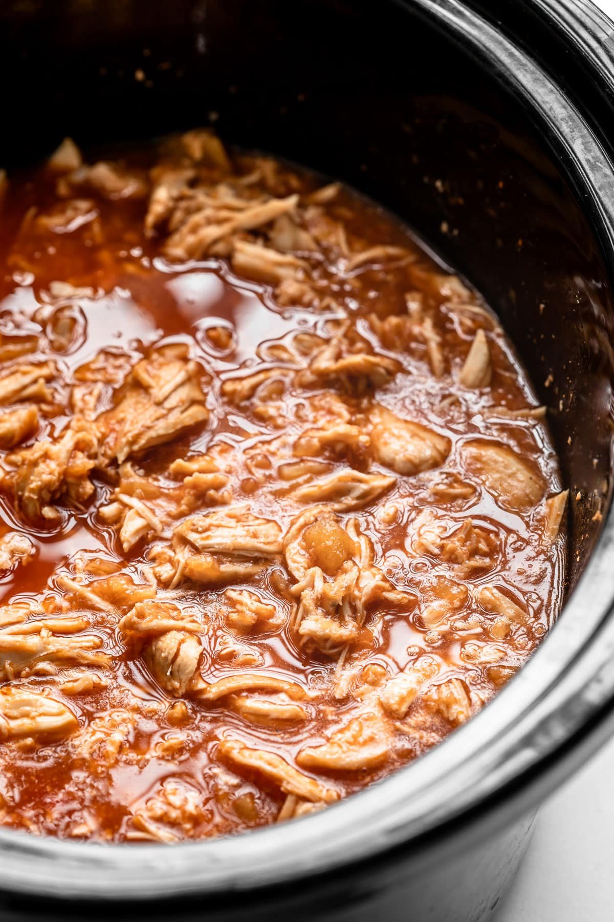 - Remove chicken from slow cooker and use a fork to shred it. Place shredded chicken back in the slow cooker. Stir.
