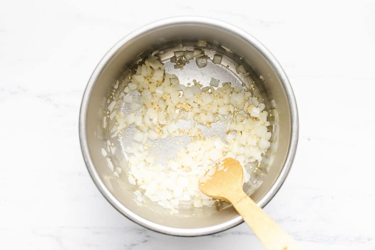 - Turn your Instant Pot to the sautรฉ setting. When itโs hot, add your olive oil (or another cooking fat of choice) and then your onion. Stir and let the onion get a bit translucent, about 2 to 3 minutes. Stir in the minced garlic and saute for one minute or until golden. Once done press the cancel button to stop sautรฉing.ย