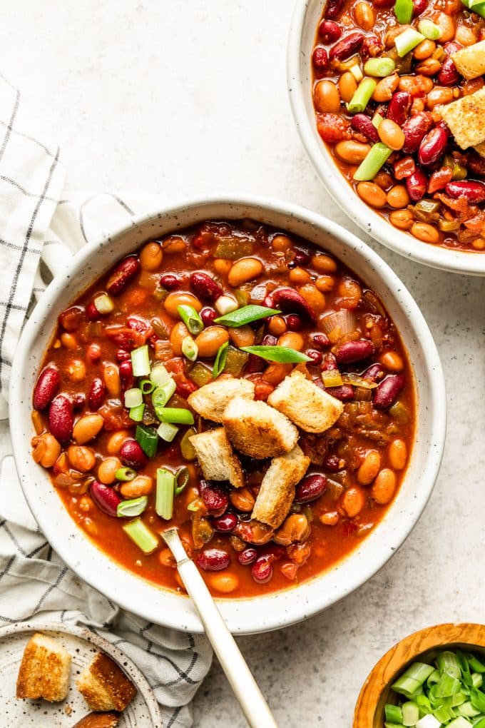 My favorite way to enjoy this hearty chili is with a handful ofย Homemade Croutonsย on top. That buttery (they donโt have actual butter in them) crunch is perfection with the flavors in the chili. Crushed tortilla chips or fritos are delicious too!