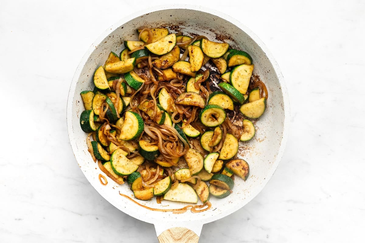 - Reduce heat to medium. Add remaining 1ยฝ tablespoons of oil to skillet with the zucchini and onion. Sprinkle with salt, pepper, ginger, and garlic powder. Stir. Sautรฉ, stirring occasionally, until the onion is translucent and zucchini is tender, about 7 to 10 minutes.