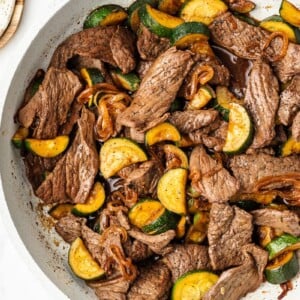 To make this dish first brown the steak first in a large skillet and then set it aside. It’s going to cook fast since we’ve thinly sliced it. Then add your zucchini and thin strips of onion to the skillet to get them tender. Season. Incorporate the coconut aminos, rice vinegar, and seasonings. Get ready to eat!