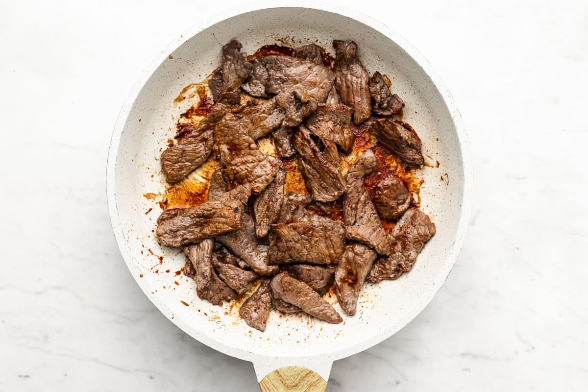 - Heat 1 tbsp of oil in a large skillet on medium-high heat. (I recommend a 12" skillet so you have room for everything.) Once oil is hot, add your thinly sliced steak pieces. Cook until steak is browned, stirring frequently, about 2 to 3 minutes. The steak doesn't need to be completely cooked through. Remove steak from pan and set aside. (Leave any remaining liquid in the skillet to cook our veggies in.)