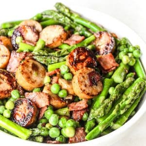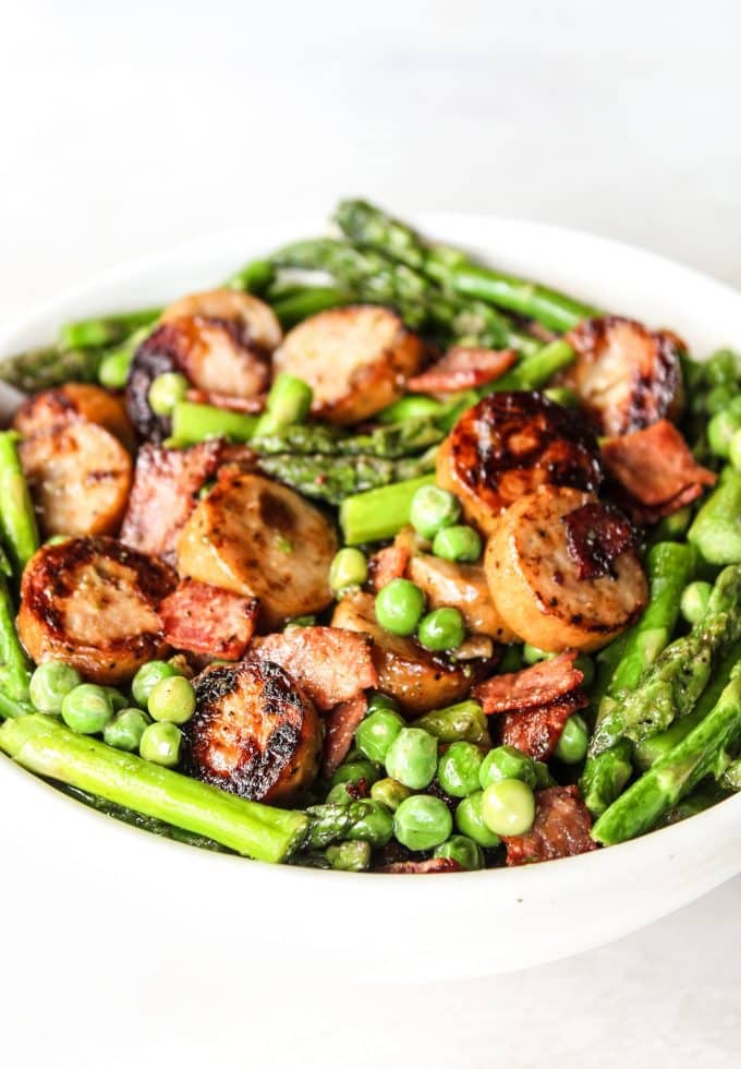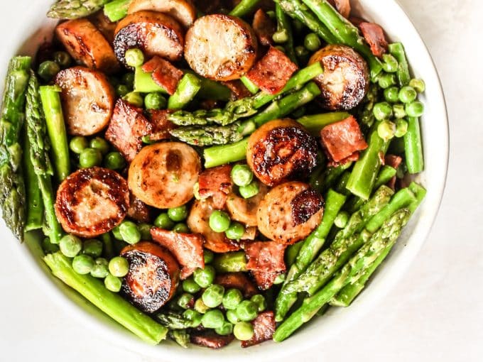 This light and simple meal includes sausage, crispy bacon, tender asparagus, and peas. It’s easy, fast, and all cooks together in a skillet!