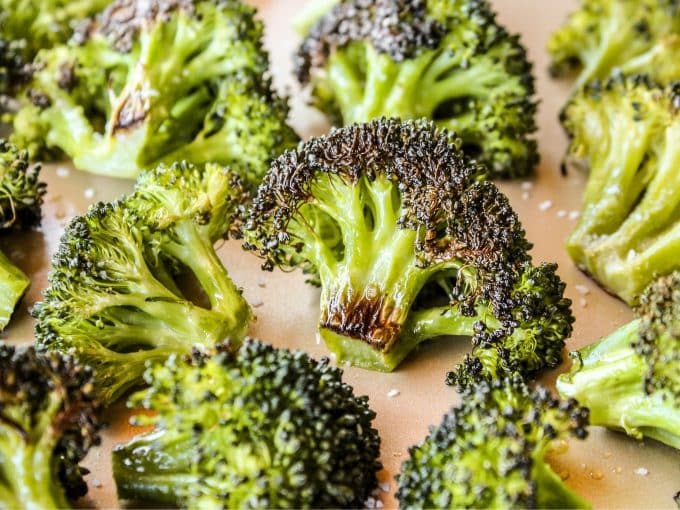 To make this recipe you’ll spread your fresh broccoli florets on a baking sheet. Drizzle with extra-virgin olive oil. Then season with salt and garlic powder. Bake until broccoli is tender with some charred crispy edges!
