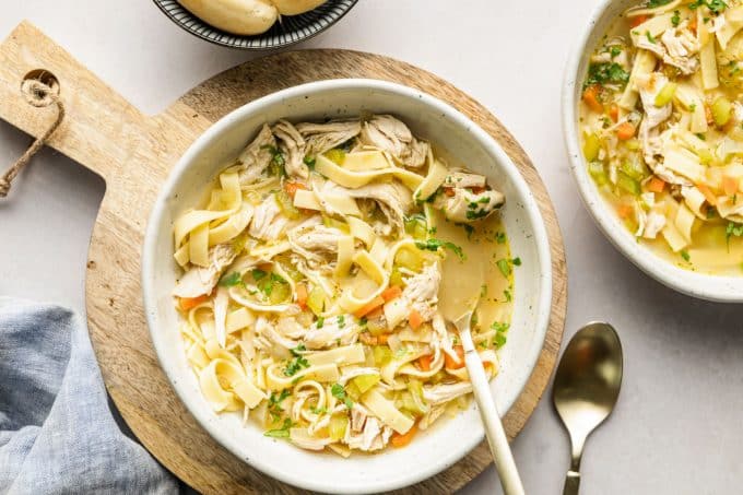 I strongly recommend wide egg noodles (this is a classic chicken noodle soup after all) but you can use other pastas like rotini or bowtie. I’ve found that different pastas will absorb varying amounts of the chicken stock. For instance, when I tested this with elbow noodles I was left with very little broth in the finished soup! So if you’re not using egg noodles be prepared to add extra chicken stock while it all cooks.