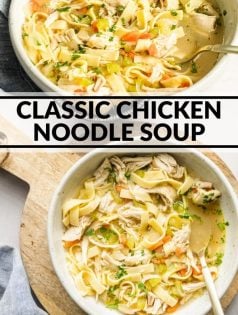 My gateway soup (the one that started me on the path of my torrid soup love affair) is chicken noodle. It’s the first soup I ever loved and the one I’ll always crave when I’m feeling sick. I’ve had several variations on the blog for a while (if you’re wanting a low carb version I highly recommend my 30 Minute Lemon Chicken Soup) but never the original! Today’s the day to remedy that. I present to you my Classic Chicken Noodle Soup. (I’m imagining applause. Thank you, thank you.)