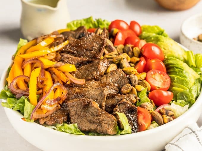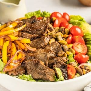 • To assemble the salad, divide your chopped lettuce into bowls. Top with tomatoes, avocados, and pistachios. Add peppers, onions, and steak.