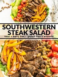 This Southwestern Steak Salad with Lime Vinaigrette is so flavorful and hearty! Juicy seared steak, peppers, onions, avocado, tomato, fresh cilantro, and crunchy pistachios! Plus the super simple dressing will blow you away! You’ll never believe it’s all Whole30 compliant, dairy free, and gluten free.