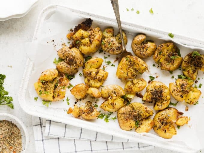 To achieve the right amount of crispiness these potatoes cook twice. First, in a pot of water. Second, in the oven. It’s not hard and it’s most definitely worth the extra effort. Give the potatoes a quick boil to soften them up so they’re ready to be smashed. Then gently press down on each potato with a potato masher, add spices for lots of big flavor, and roast. When they come out of the oven they are crispy, buttery, and oh so incredible.