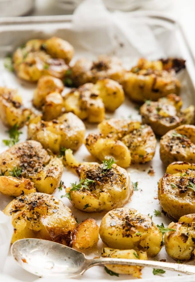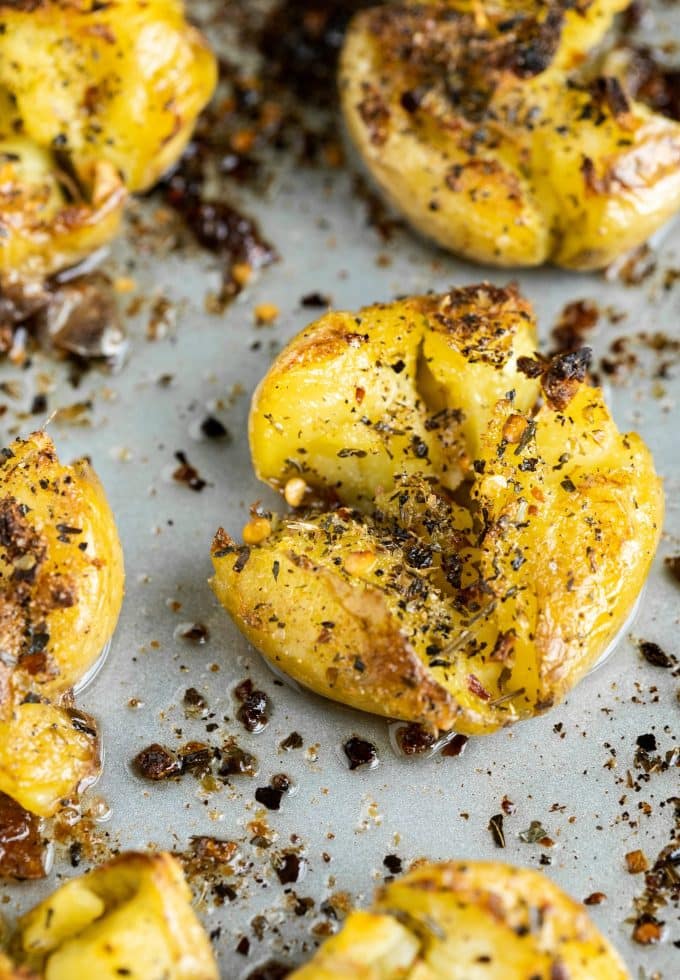 Smashed & Roasted Italian Potatoes are crispy on the outside, buttery, and big on flavor! You won’t want to stop eating them!