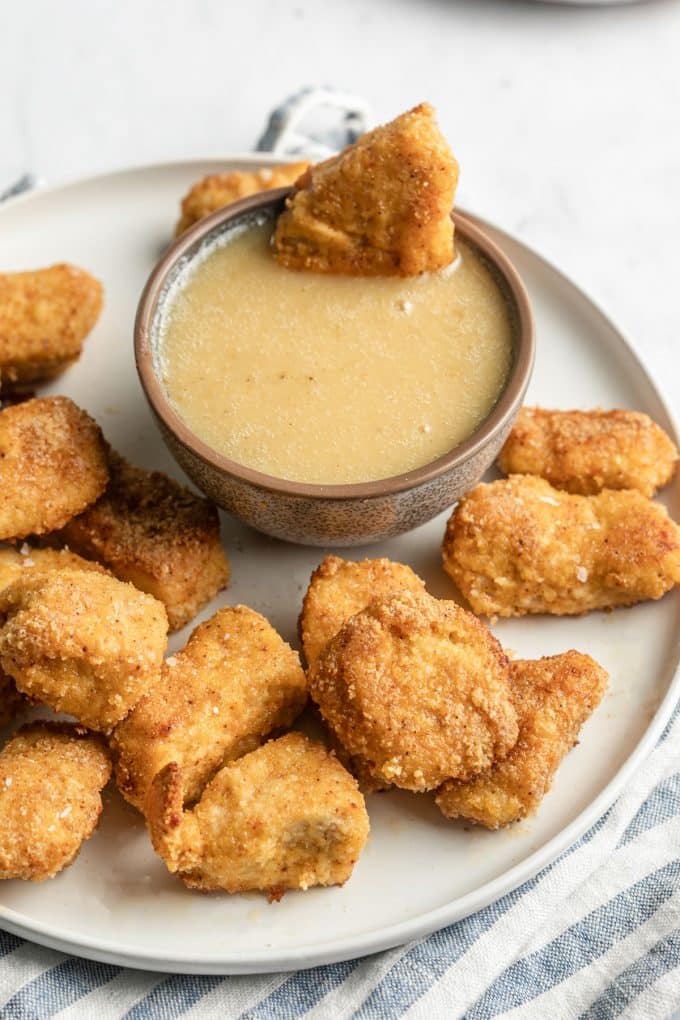 - Make sure you drip off any excess egg wash before dipping your nuggets into the breading mixture. This is an important step that you don’t want to skip. Otherwise the egg will end up in the breading, causing it to clump together.