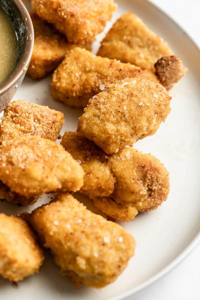 I’m using simple seasonings to make these nuggets flavorful but still perfect for young children. Adults will want them too. Oh I sure do. The first time I tested this recipe I mowed through half the sheet pan myself. That’s not a serving size, friends. I have no regrets.