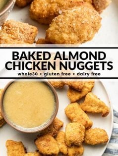 These crispy chicken nuggets are easy to make, use almond flour for the breading, and are baked instead of fried!