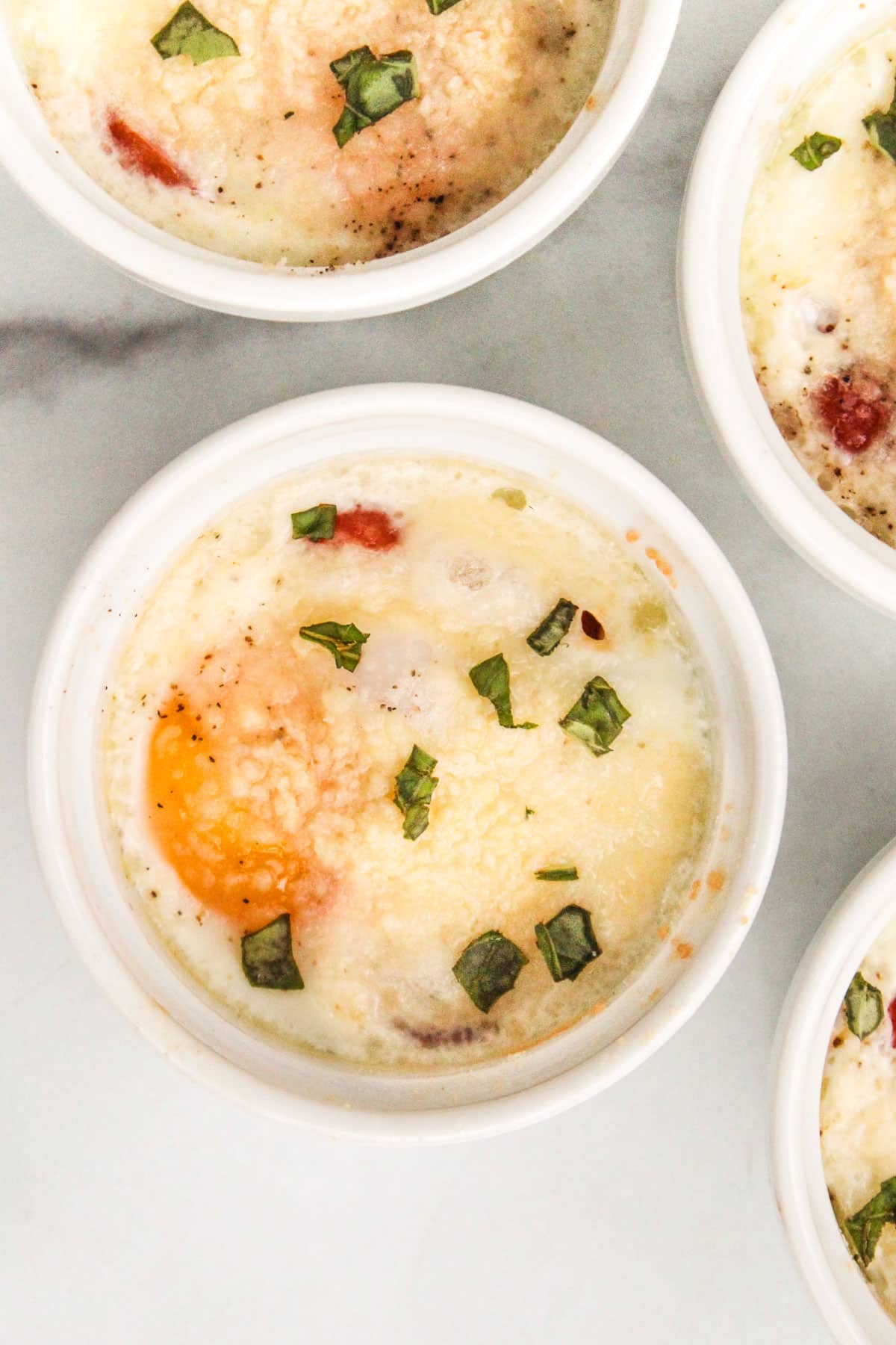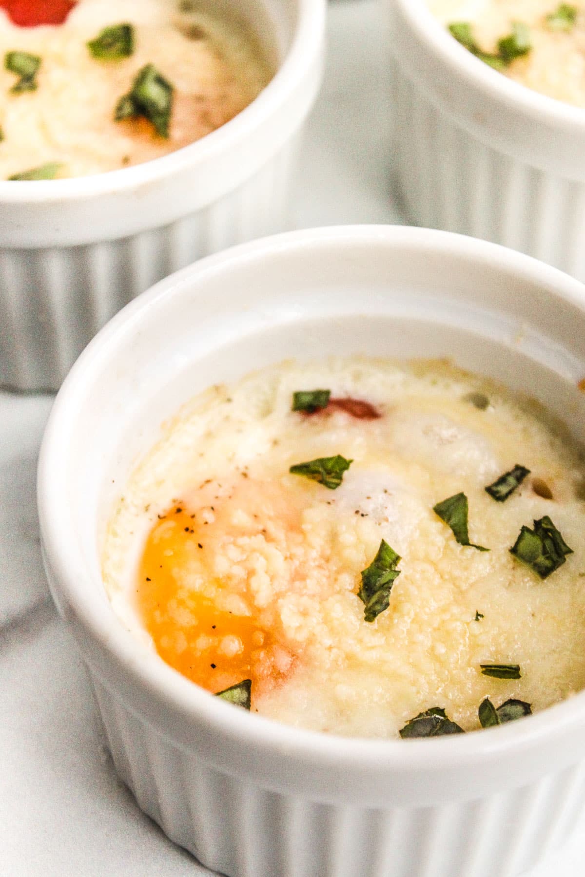 This baked egg recipe is perfect for entertaining or when you just want to treat yourself to a special (but still easy) breakfast. Topped with parmesan and fresh basil, each egg cooks in an individual ramekin for an elegant presentation.