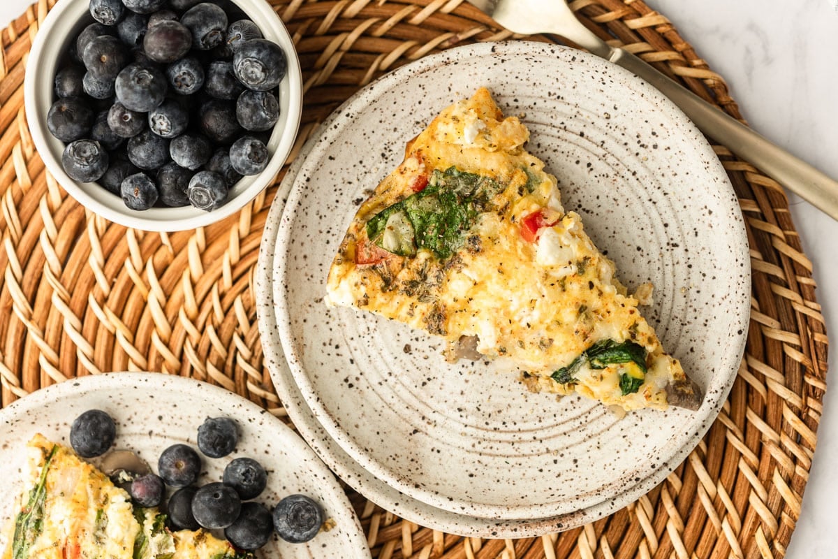 This Vegetable Frittata includes two types of cheese: mozzarella for the melt we want and feta for saltiness and a great texture contrast. I just love these two together. We’re also adding onion, bell pepper, mushrooms, and spinach to really fill this entree out. The end result is full of flavor and so beautiful.