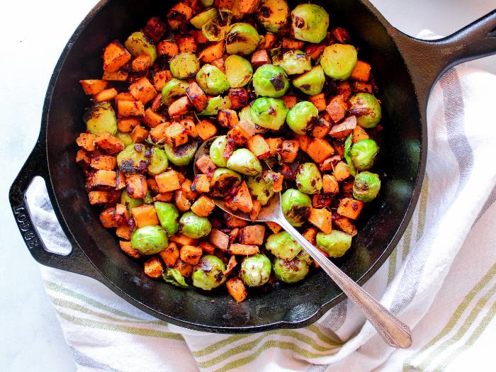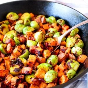 Sweet Potato Bacon Hash is an easy side dish you can enjoy with breakfast, lunch, or dinner! Sweet potato, bacon, and brussels sprouts… what’s not to love?