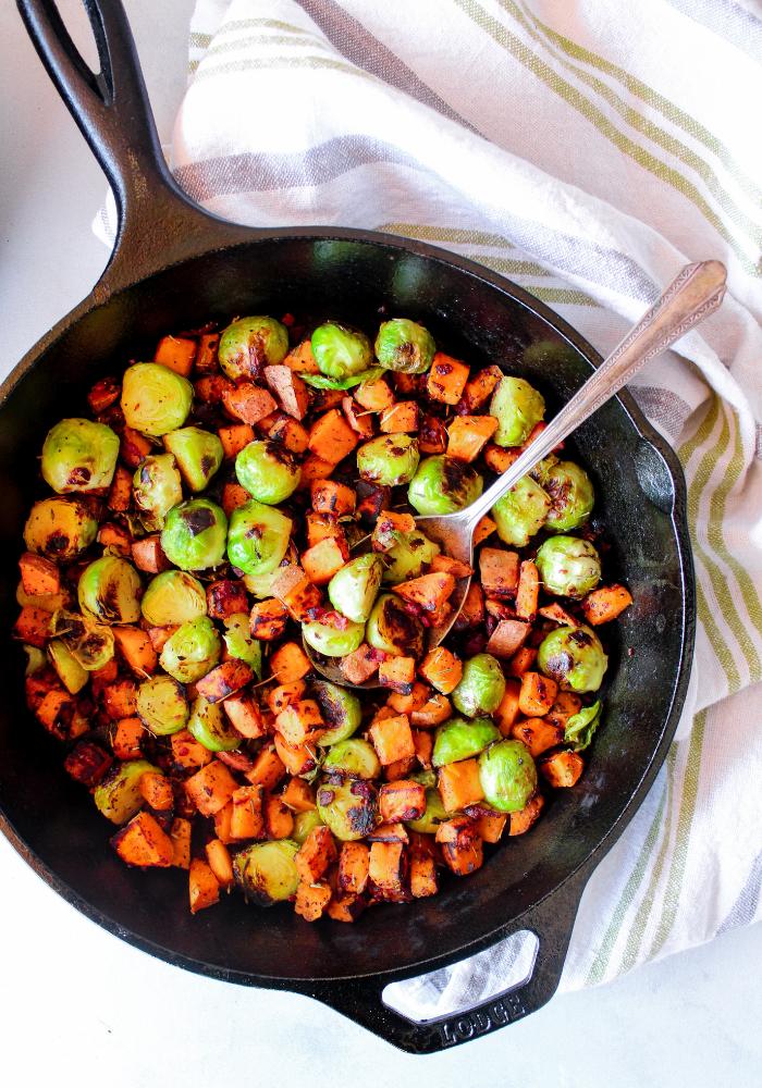 - Add diced sweet potato, diced bacon, and halved brussels sprouts to the skillet. Sprinkle with salt, pepper, dried rosemary, and dried thyme. Stir.