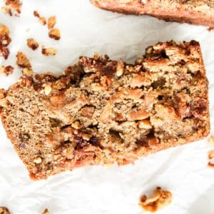 This gluten free apple bread is moist, cake like, and filled with dried apples. Plus it’s topped with an easy sweet crumble!