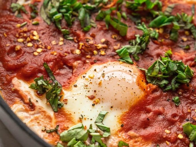 Poached eggs are cooked by adding them to simmering water. The eggs in this dish actually cook in our sauce as it simmers. The end result is firm whites (but not too firm) with runny yolks.
