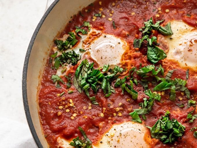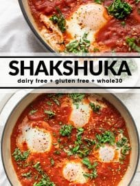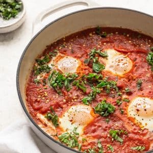 This Shakshuka is delicious over buttered toast, sautรฉed potatoes, or roasted veggies.