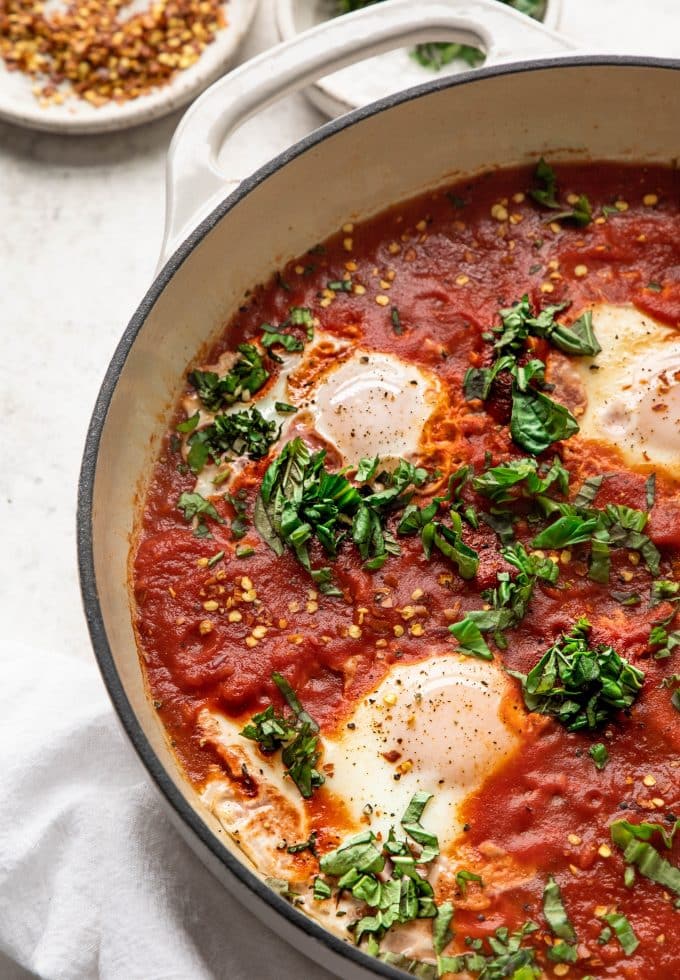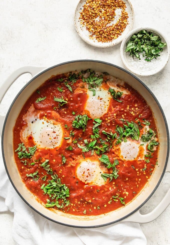 If you’re not familiar with Shakshuka, it’s a North African dish that’s commonly prepared in the Middle East today. It consists of eggs poached in tomato sauce. The sauce usually has flavors of garlic, onion, and paprika.