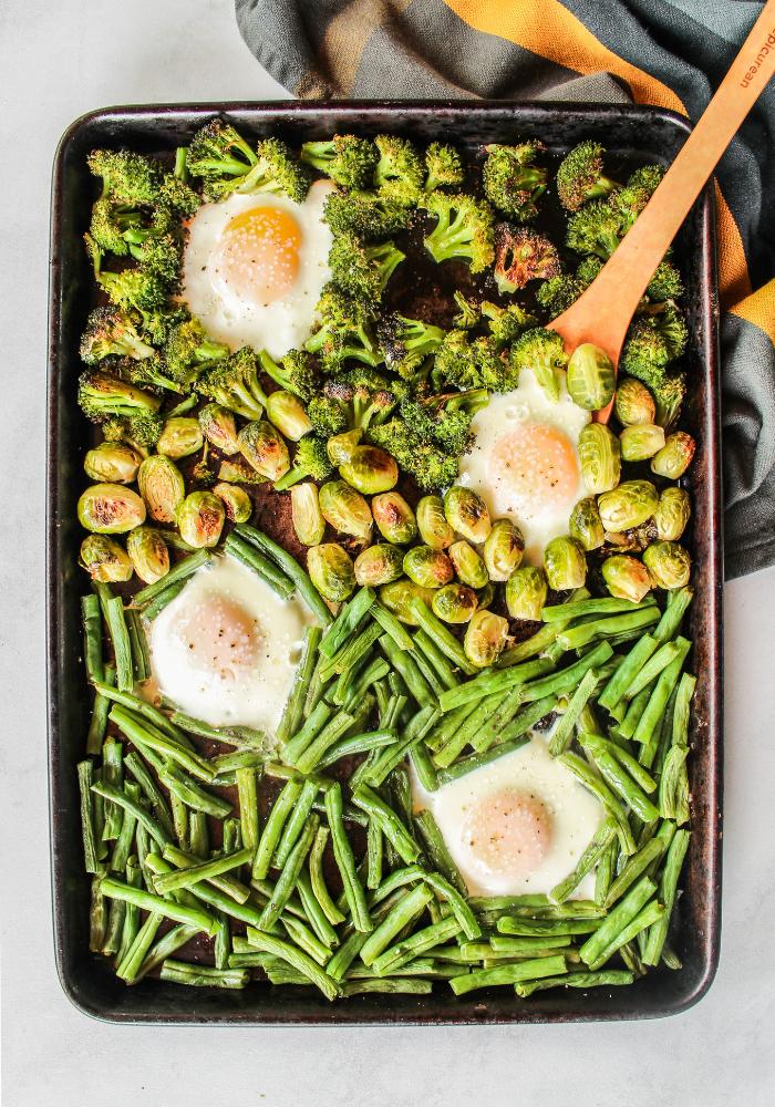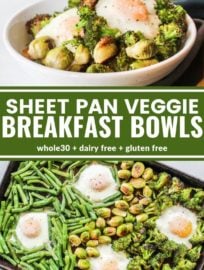 These Sheet Pan Veggie Breakfast Bowls are packed with roasted broccoli, brussels sprouts, and green beans along with perfectly baked eggs! A complete meal on one sheet pan!