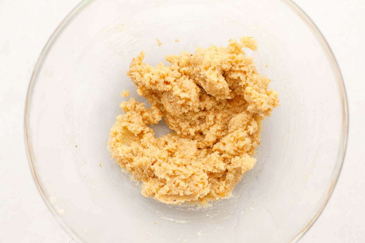 - In a large bowl stir together almond flour, pure maple syrup, orange juice, softened butter, almond extract, salt, and zest from half an orange. (It will seem dry when you start stirring but a dough will form as you continue to stir.)