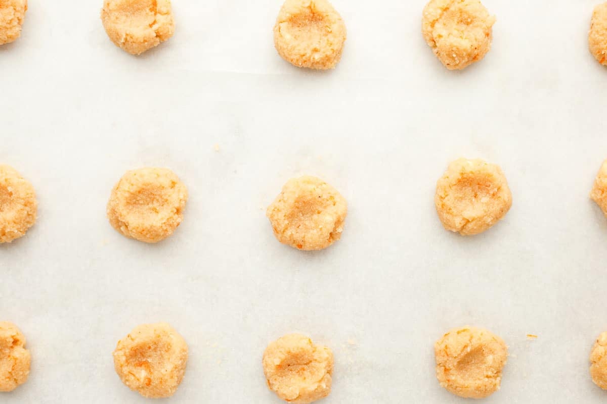 - Use a tablespoon or 1-inch cookie dough scoop (this is a small cookie scoop) to measure out the dough. Roll each into a ball. You should have 15 total cookies. Place each ball of dough on the parchment paper lined baking sheet so they're not touching. Use your thumb, finger, or the back of a spoon (although this can be a little sticky so be gentle) to gently press the middle of each dough ball.