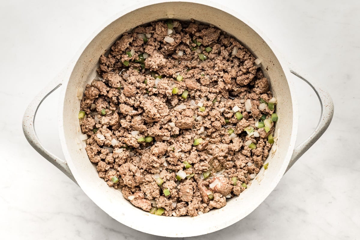 Start by crumbling your lean ground meat in a large pot. Then add the diced onion and bell pepper. Sautรฉ on medium-high heat until your beef is browned and the onion and pepper are tender. (You can also sautรฉ the green pepper and onion in a little olive oil separately but I’ve found that the fat in the beef works well and no oil is necessary.) Once the meat is browned, add the remaining ingredients. Now cover and simmer everything together for 20 to 25 minutes.