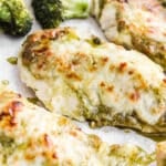 This easy sheet pan pesto chicken meal comes together quickly with chicken breasts, broccoli, pesto, and melty mozzarella. This is a family favorite dinner even the kids will love!