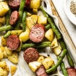 Dinner is served in only 30 minutes with this easy sheet pan meal! Sausage, potatoes, and green beans roast together in this recipe the whole family will love.