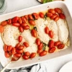 Spread 1 tbsp of olive oil on the bottom of a baking dish. Add the fish in an even layer so the fillets aren't touching. Sprinkle fish with salt and pepper. Top with lemon juice. Then drizzle remaining 1 tbsp of oil on top of the fish. Spoon minced garlic between the fillets. Add the tomatoes.