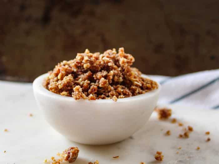 About this crumble. Oh my goodness it is a game changer for sweet potatoes. Pecans, dates, and coconut oil are all you need. The dates are naturally sweet so they elevate everything and really make sugar completely unnecessary. The pecans toast beautifully in the oven. Together they are magical.