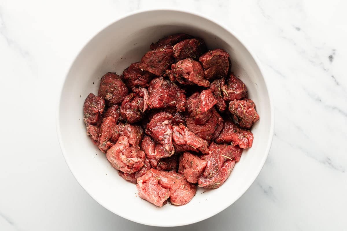 - Add the steak bites, olive oil, Italian seasoning, salt, garlic powder, and black pepper to a medium-sized bowl. Toss to coat the steak pieces in the oil and seasonings. (If using an oil spray you can spray the steak while in the bowl and stir so the pieces are coated in seasoning.)