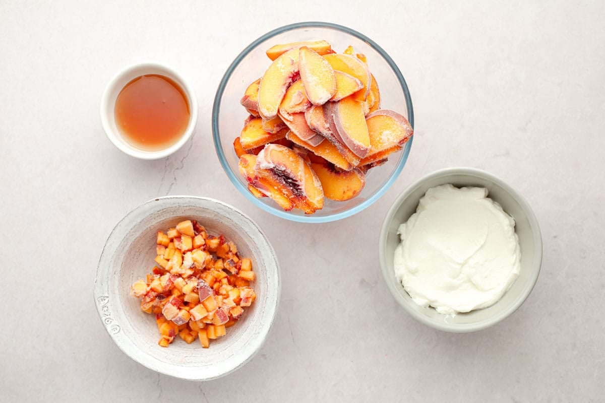 - Frozen peaches: Weโre including lots of frozen peaches in this delicious frozen yogurt for maximum peach flavor. Since theyโre already frozen they also help us achieve the texture we want quickly!