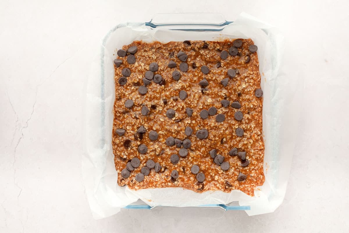 Spread the mixture in an even layer in a parchment paper lined baking dish. Press the remaining 1/4 cup chocolate chips into the top of the bars.