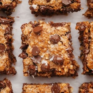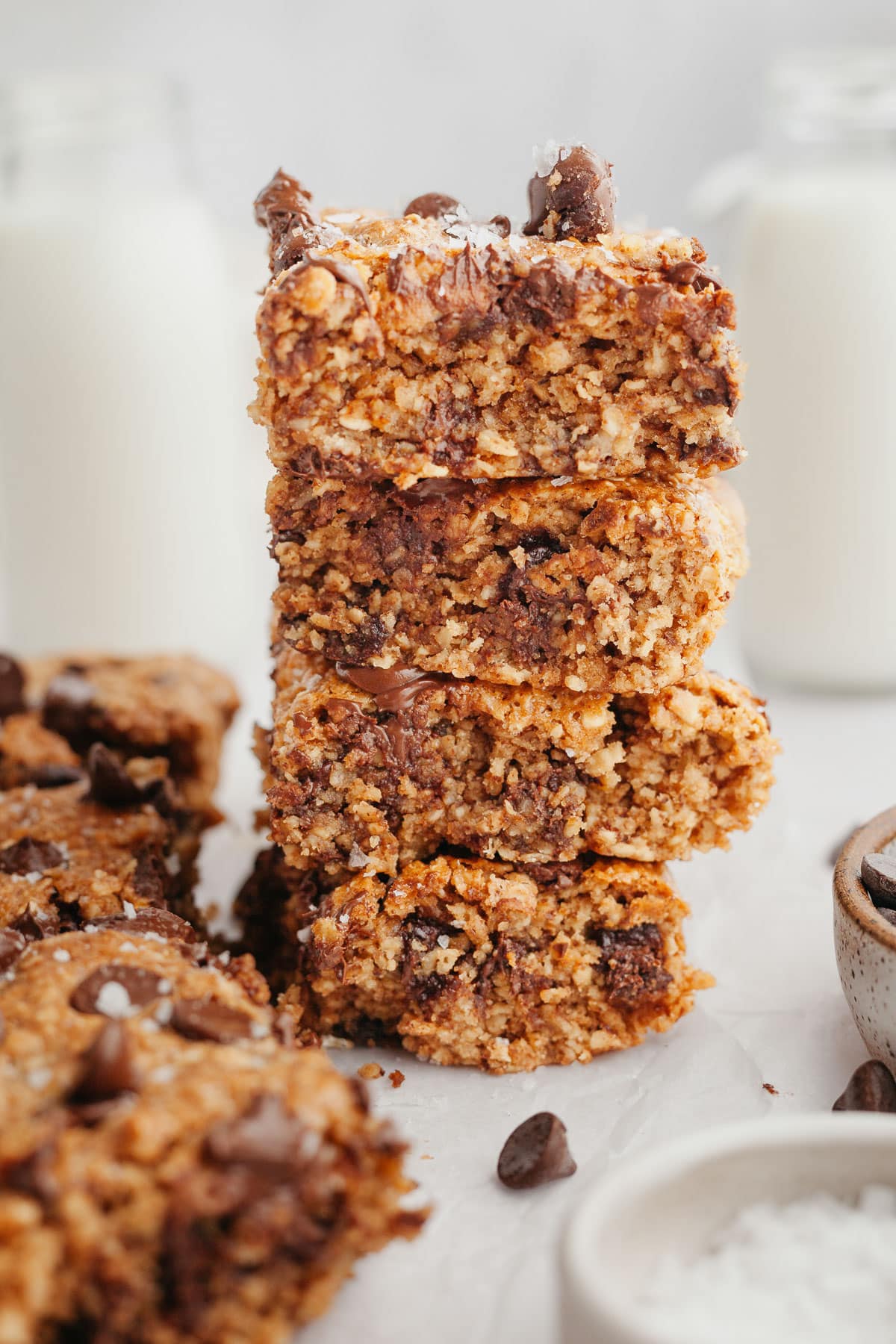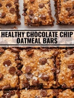 These chocolate chip oatmeal bars are thick, chewy, and made with wholesome ingredients. You’ll love every chocolatey bite of this sweet dessert or healthy snack!